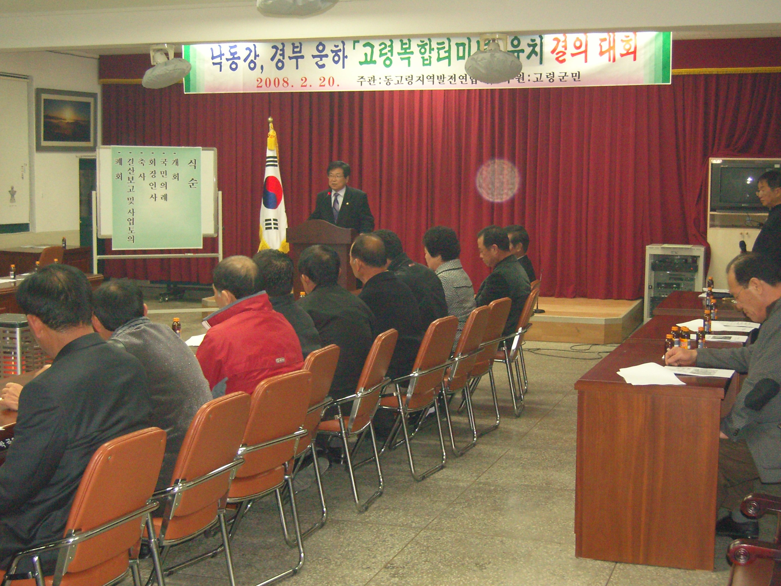 | 곽광섭 고령군의회 의장은 낙동강 경부운하 고령복합터미널 유치 결의대회에 참석하였다. 일 시 : 2008. 2. 20(수) 장 소 : 성산면사무소 회의실 |